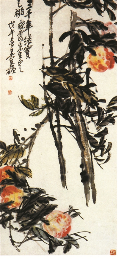 吳昌碩,原名俊,俊傾,字昌碩,別號(hào)缶廬、大龍、苦鐵等,浙江安吉人?!霸?shī)、書、畫、印”四絕的一代宗師,與任伯年、趙之謙、虛谷齊名為“清末海派四大家”?!度杲Y(jié)實(shí)之桃》,作于1918年。這幅作品運(yùn)用篆書筆法,疏闊縱放,雄渾有力,顯現(xiàn)出磅礴而茁壯的氣勢(shì),筆力強(qiáng)悍,是吳昌碩大器晚成的絕佳寫照。