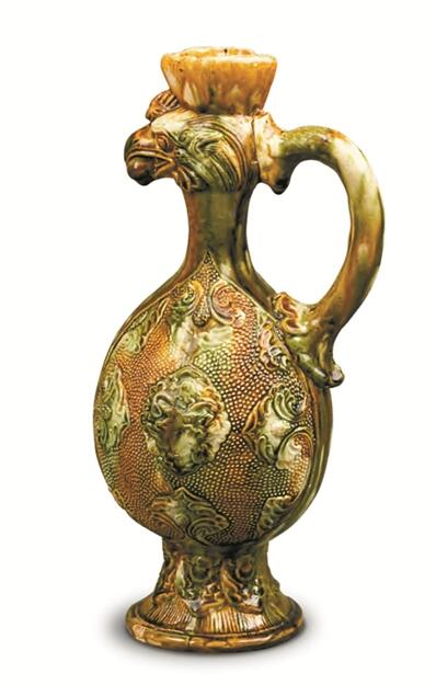 三彩印珍珠地貼獸面紋鳳首壺。