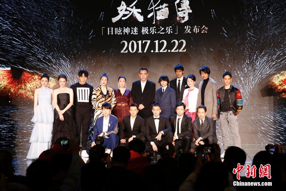 12月17日,由陳凱歌導(dǎo)演的賀歲奇幻題材電影《妖貓傳》在北京舉行全球首映發(fā)布會(huì),導(dǎo)演陳凱歌,制片人陳紅攜主演黃軒、染谷將太、張雨綺、秦昊、張榕容、張魯一、劉昊然、阿部寬、松坂慶子等亮相。影片改編自日本作家夢枕貘的魔幻系列小說《沙門空?!罚瑢⒂?2日起在中國內(nèi)地上映。圖為眾主創(chuàng)合影。中新社記者 李慧思 攝