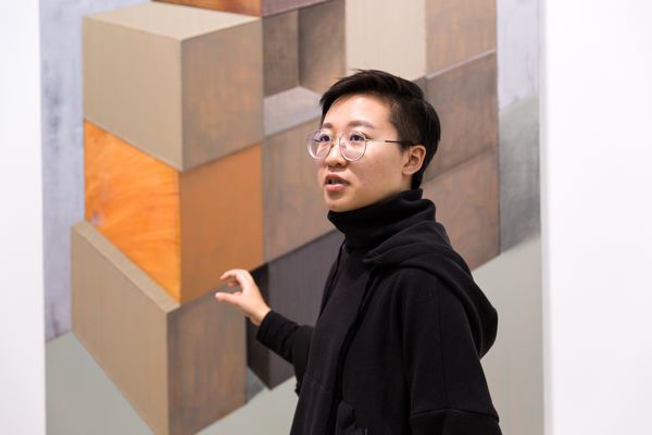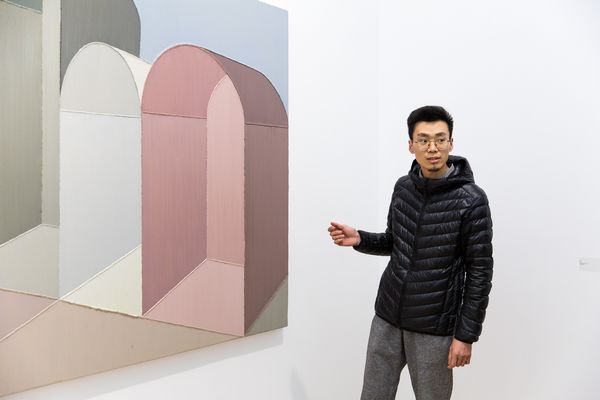 藝術(shù)家趙新宇,1989年出生于內(nèi)蒙古,2012年畢業(yè)于四川美術(shù)學(xué)院油畫系。趙新宇最早的創(chuàng)作,即為人所知的“車廂”系列,涉及了一種日常經(jīng)驗(yàn),后續(xù)階段的作品以情緒性和敘事性為底色,而使得整個(gè)畫面頗具戲劇色彩。在新作當(dāng)中,這一痕跡的延伸則是趙新宇似乎試圖通過對畫面結(jié)構(gòu)的編排,對比之前的作品,依舊是在構(gòu)景,但卻在逐漸在取締物的現(xiàn)實(shí)性因素。新作當(dāng)中技法的轉(zhuǎn)變,厚涂式的平推僅保留了一部分,新作當(dāng)中的轉(zhuǎn)向在某種程度上僅僅構(gòu)成了對于厚涂畫法的一個(gè)對立面發(fā)生,像是一次新的開場,畫面本體基本問題再次噴涌而來,在這一情形下,趙新宇通過對于框架結(jié)構(gòu)式描繪的轉(zhuǎn)向,試圖引向一種對于畫面心理的感知。