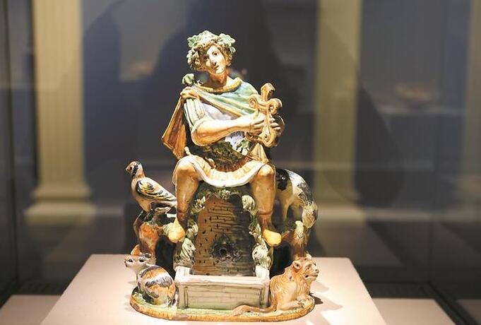 還有一些作品直接被塑為人形,比如16世紀(jì)末,由烏爾比諾的潘塔納茲工坊所作的人像水罐,表現(xiàn)的是傳說中半人半神的奧菲歐彈奏豎琴迷惑動(dòng)物,他坐在一個(gè)圓桶上,液體從桶下方的小孔流入池中。據(jù)克勞迪婭·卡薩利介紹,這件產(chǎn)品專為私人居所而設(shè)計(jì),可能在豪奢的宴會(huì)上用作烈酒容器。