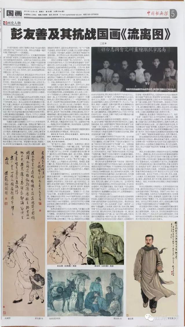 彭友善一生主要參加了兩次美術(shù)界的盛會。第一次是1937年國民政府教育部第二次全國美展,其以《噩夢》、《大同世界》、《華清池》、《伴侶》四幅巨作同時入選而獨自打破了參展數(shù)量和作品尺寸二項記錄,成為這屆美展最耀眼的新星,被媒體稱為“新國畫的鼻祖”,其中《噩夢》一畫入選日本版之《世界名畫全集》,并順理成章成了中華美協(xié)的發(fā)起人之一,是年彭友善才二十六歲。另一次是參加1954年的新中國第二屆全國美展,其參展作品是大型人物主題創(chuàng)作《方志敏漆工鎮(zhèn)暴動勝利圖》,獲本屆美展最高榮譽獎,并成為當(dāng)年人民美術(shù)出版社出版的美展專集首頁。兩次大展的參與者,均為中國美術(shù)界的重量級人物,彭友善與之同臺競技而脫穎而出,可見其功力非同一般,其歷史地位更不應(yīng)被埋沒?!俺鋵嵍泄廨x”(周谷城語),“千秋筆墨驚天地”(李苦禪語)“超真筆墨功力堪列國內(nèi)一流畫家方陣,經(jīng)得起歷史檢驗。”(程大利語)都是對彭友善藝術(shù)成就的中肯評價。