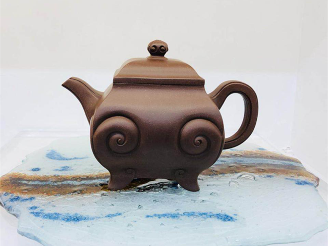 本次所攜的另一款參展參賽作品是由大學(xué)藝術(shù)教授楊杰先生設(shè)計、唐朝霞老師親自制作的《大吉祥》。大吉祥壺一四方壺為基本形體,輪廓線條凹凸曲直、動靜結(jié)合,富有變化。壺體四角為“吉羊”的變形,羊角夸張為一對如意卷云紋,與壺鈕、壺足相互呼應(yīng),寓示吉祥如意的內(nèi)涵。
