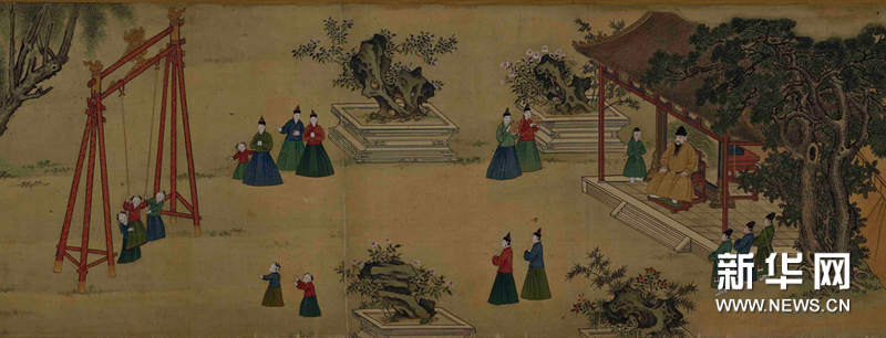 與明代帝王有關(guān)的行樂(lè)圖,目前存世有數(shù)幅,如中國(guó)國(guó)家博物館藏《憲宗元宵行樂(lè)圖》、北京故宮博物院藏《明宣宗行樂(lè)圖》卷等。此幅《四季賞玩圖》,曾在大英博物館“明:皇朝盛世五十年”展覽中展出。畫(huà)卷描繪皇室四季賞花行樂(lè)的場(chǎng)景,春日賞牡丹、夏季賞紅蓮、重陽(yáng)賞金菊、冬季賞雪梅。頭戴黑色便帽、身穿繡金龍袍的憲宗皇帝,前后共5次出現(xiàn)在畫(huà)面里。松樹(shù)亦出現(xiàn)在各個(gè)橋段,扮演重要角色:一開(kāi)始,憲宗皇帝坐在雙松下的草堂里觀看女童蕩秋千;春賞牡丹時(shí),憲宗所坐的琉璃涼亭外,被古松圍繞;秋冬交界處,以青松和雪松表示季節(jié)的變化,雪松下的便殿也銀裝素裹,憲宗也換上棉袍,戴著貂皮帽。畫(huà)面瑰麗堂皇,一派太平喜樂(lè)氛圍。