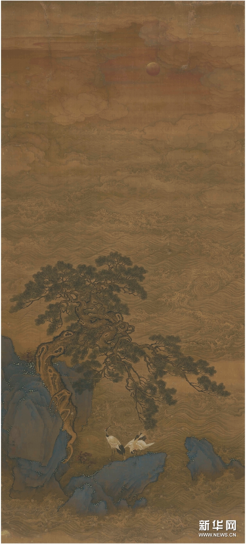 徐玫,清初畫(huà)家。字采若,號(hào)華塢,蘇州人。主工花鳥(niǎo)、人物,兼事山水,賦色妍雅,生動(dòng)盡致。善臨摹古本,與柳遇并挾盛名,“兩人凡臨摹古本逼真處,可謂之翻身鳳凰也”。因其技藝出色,后供奉內(nèi)廷,曾參與繪制《康熙南巡圖》,亦有《春宮圖》組畫(huà)存世,人物、園庭、植景無(wú)所不精。唐代無(wú)可和尚詩(shī):“與鶴來(lái)松杪,開(kāi)煙出海波?!毕生Q、松樹(shù)、旭日、海波,這種組合象征著長(zhǎng)生不老,延年益壽,為宮中祝壽的標(biāo)準(zhǔn)樣式,類似圖式也出現(xiàn)在郎世寧筆下。雖然此畫(huà)是“壽與天齊”的命題創(chuàng)作,但從畫(huà)風(fēng)可以看出,徐玫不僅繼承了宋人畫(huà)法,而且注重寫(xiě)生,凡筆到處,無(wú)不古意而生動(dòng),難怪王石谷對(duì)他有“立法精妙,直入宋元名家之室,雖仇(英)唐(寅)諸公,亦不得專美于前”的贊譽(yù)。