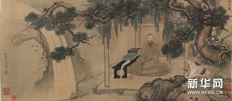 禹之鼎,清初畫(huà)家。字尚吉、上吉、尚基,江蘇揚(yáng)州人??滴跄觊g供奉內(nèi)廷,授鴻臚寺序班,入值暢春園。工山水、人物,尤精寫(xiě)真,作品多為當(dāng)時(shí)的重臣文翰傳神寫(xiě)照,“一時(shí)都下名公通人描畫(huà)殆遍”,自稱“必逢佳士亦寫(xiě)真”,是繼晚明曾鯨之后又一位杰出的肖像畫(huà)家。此圖作于康熙三十九年,作者時(shí)年五十四歲。傳主為清初文壇領(lǐng)袖王士,曾在揚(yáng)州為官,禹之鼎十多次為他畫(huà)像?!岸U悅”一詞是佛教用語(yǔ),形容參禪悟道之后的法喜。此畫(huà)借佛教精神,彰顯中心人物退養(yǎng)林泉、游神禪悅的氣韻風(fēng)度。用筆纖潤(rùn),設(shè)色明麗,一株象征長(zhǎng)青不老的百尺翠松橫貫畫(huà)面,松蘿低垂覆罩茅廬,松下白鶴振翅,引吭向天,茅廬里趺坐這位著淡黃衲衣的一代宗匠。幾案上放置經(jīng)函和拂塵,茅廬外澗泉如明月,此類澗泉多見(jiàn)于水月觀音畫(huà)。