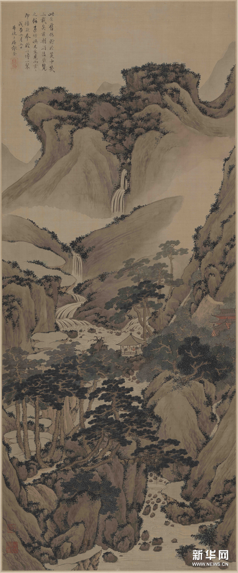 張崟,字寶崖,一字寶巖,號夕庵、且翁、夕庵老人,鐵甕城東蟄叟。丹徒(今江蘇鎮(zhèn)江)人,所居曰“飲淥草堂”。幼承家學(xué),以詩畫著名京江。花卉、竹石、佛像皆佳,尤擅山水,善畫松,時顧鶴慶善畫柳,有“張松、顧柳 ”之譽(yù),世稱“丹徒派”。此畫描繪崇山幽壑、危巖高崗之間,高士攜友宴坐茅亭,聽泉論道。亭后危磴入云,寺觀樓閣深藏山蔭。畫面構(gòu)圖巍偉,雄奇郁茂,虛實結(jié)合,山林野趣盡出于紙墨之間。由左上方的題識可知,此畫創(chuàng)作完成后,畫家自藏三年,花朝節(jié)與友人飲酒,一時起興,展圖共賞,結(jié)果被友人索去,便補(bǔ)了段題跋,是為畫外趣事。