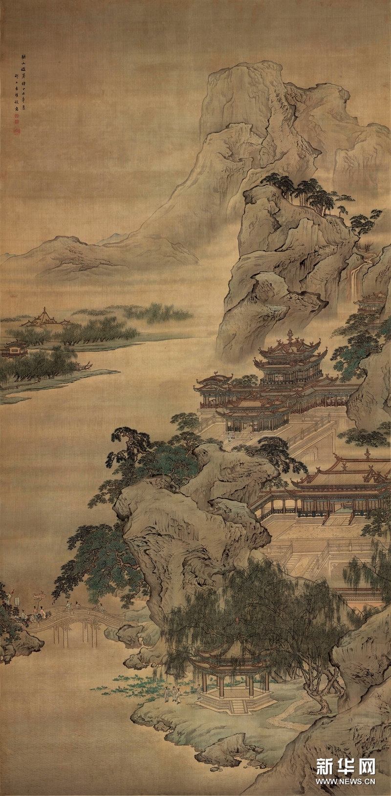 袁耀,清代畫家。字昭道,江都(今江蘇揚(yáng)州)人。畫家袁江之侄。約活動于乾隆中期,以界畫見長,工整華麗,畫風(fēng)與袁江相近。偶作花鳥,亦甚佳。袁耀擅作山水,樓閣界畫,氣勢恢弘,題材常為《驪山避暑》、《蓬萊仙島》等歷史故事和神話傳說,且能作高頭大卷,其精品甚至超過袁江。此畫描繪唐明皇前往驪山華清宮避暑消夏的情景,畫面遠(yuǎn)景高山崇嶺,云霧繚繞,層層樓閣,華美壯觀,如瓊池仙宮。畫面左下方雕砌精美的石橋上,一行宮中人往樓閣的方向去,華蓋、羽扇彰顯尊貴身份。袁耀將傳統(tǒng)建筑畫與院體山水巧妙相融,其華麗精致的風(fēng)格,為清初揚(yáng)州工致流派的典型代表。