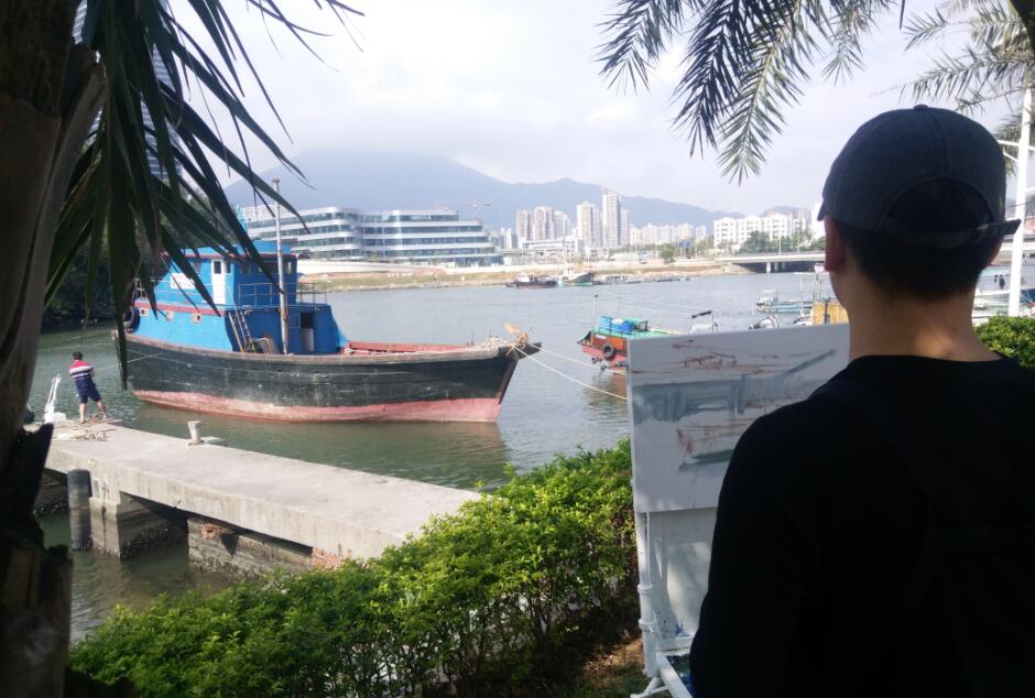 優(yōu)美的景色映入畫家們眼簾,點燃了他們的創(chuàng)作激情。來到鹽田之后,藝術(shù)家們紛紛找好寫生地點,擺好畫架,迅速進入創(chuàng)作的狀態(tài)。他們當(dāng)中一部分來到了鹽田漁港,鹽田海鮮街后的小漁村避風(fēng)港。蔚藍的大海、旁邊的綠樹、避風(fēng)塘內(nèi)停泊的船只、白色的海鳥、釣魚的人以及遠方火熱的建設(shè)場景都呈現(xiàn)在畫家的筆端;另一部分藝術(shù)家來到了位于三洲田深圳會計進修學(xué)院的梧桐溪谷,小橋流水人家、奇石山林則一一被傾注于畫紙。