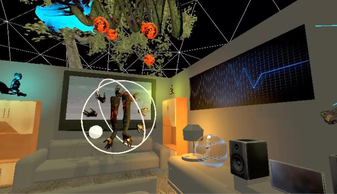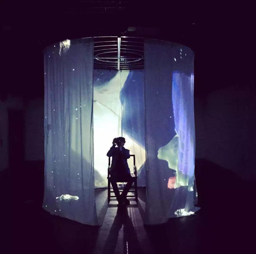 《覺醒之屋》鍍鋅鐵支架,網(wǎng)格布,三屏實時動畫,VR裝置,椅子,2018