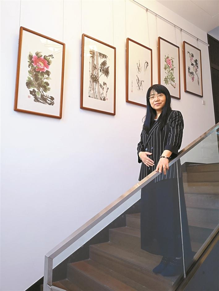 女建造師周桂云和她的國(guó)畫(huà)作品。