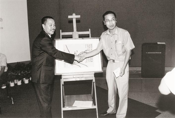 2005年7月,陳湘波(左)出席“情系災(zāi)區(qū)奉獻(xiàn)愛(ài)心——深圳市文化系統(tǒng)書(shū)畫(huà)作品賑災(zāi)義賣(mài)活動(dòng)”。