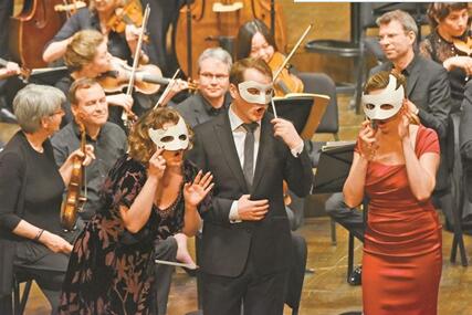 經(jīng)過對歌劇《唐璜》的嚴謹考證,勒內(nèi)·雅各布斯以鮮活的“古樂”形式還原了早期古典主義歌劇的音樂特質(zhì)。據(jù)凱撒介紹,昨晚的演出與以往歌劇表演有很大不同。音樂會版的歌劇《唐璜》中,樂團、指揮、獨唱與合唱團都在舞臺上,演員不僅會在臺前演唱,還穿梭在樂團中,帶來生動的演出。