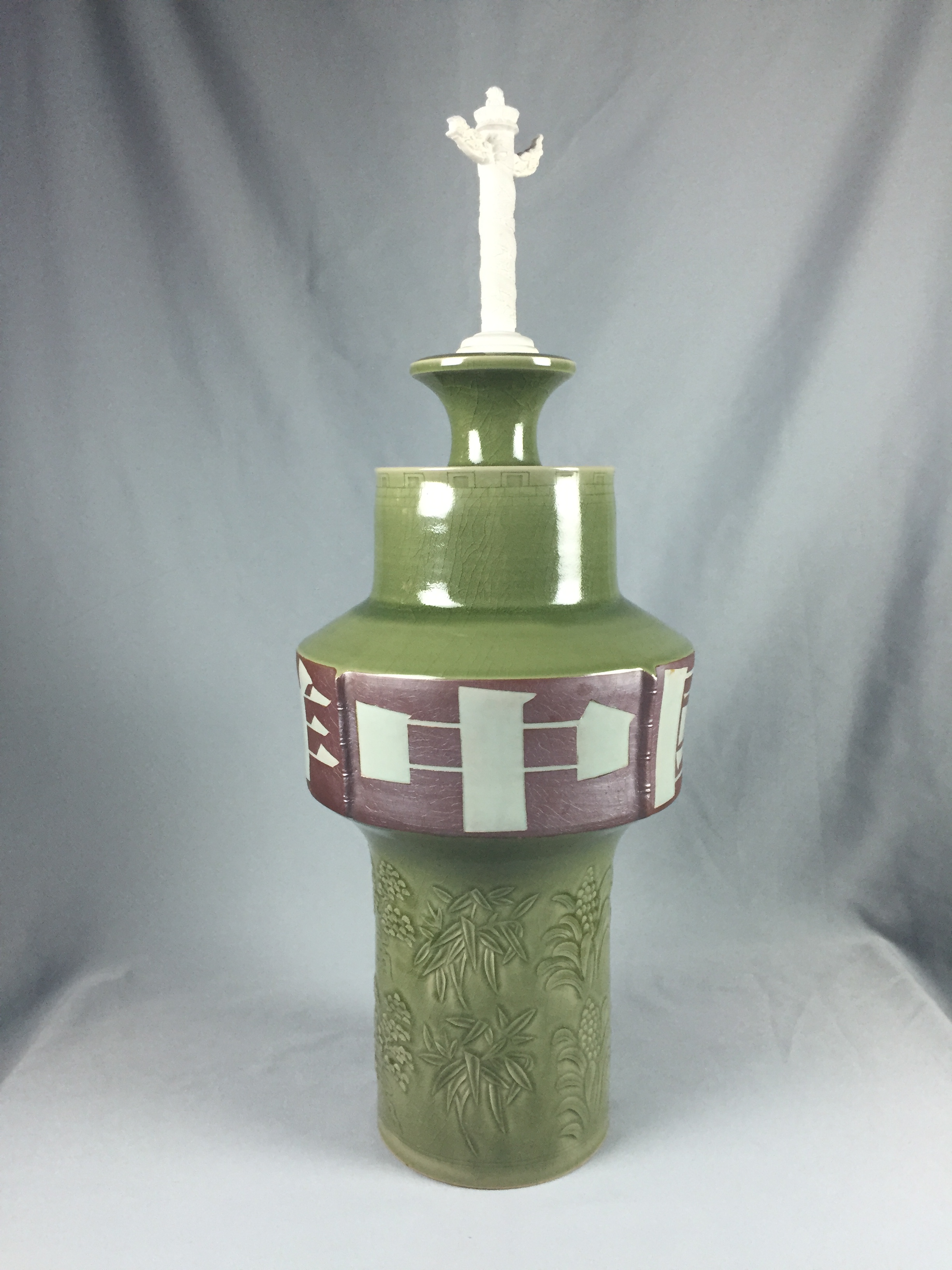 此次參與展出的青瓷作品中,一件名為“紅底玉縷耀瓷刻花松竹萬年青紋中國吉祥”的青瓷作品人氣頗高。據(jù)介紹,此件作品由中國工藝美術(shù)大師孟樹鋒親自制作。作品整體呈現(xiàn)“中”字造型,偉岸挺拔,雄渾方正,險峻奇特而大氣磅礴。瓶頂一尊華表,白泥素胎,一如漢白玉石雕。瓶肩梢高凸又微微外撇,是一圈五十六個垛峰與垛口的萬里長城,代表著中國五十六個民族團結(jié)一心。其下碩腹,則使用耀州紅底玉縷的工藝書寫“中國吉祥”四個雕版大字,點明作品主題。下部立柱上刻、劃、貼花的萬年青、青松、竹子,體現(xiàn)耀州瓷的風(fēng)格并以此祝福祖國。