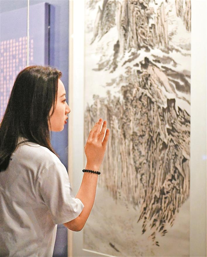 展覽一經(jīng)推出,就迅速吸引了絡(luò)繹不絕的市民前來參觀。面對(duì)暑期人流量大的情況,關(guān)館特地推出了豐富多樣的公共教育服務(wù)。不僅有志愿者導(dǎo)覽,還有親子工作坊、數(shù)字化設(shè)計(jì)等等,內(nèi)容接地氣,趣味橫生。記者看到不少孩子都在家長的指引下拿著畫本在美術(shù)館里臨摹、學(xué)習(xí),通過這種方式與國畫家們一起交流切磋。
