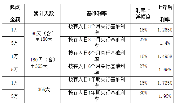 據(jù)悉,“靈活息”是廣發(fā)銀行近期推出的活期協(xié)議產(chǎn)品,客戶(hù)簽署協(xié)議后,活期賬上的存款即可依據(jù)達(dá)到起點(diǎn)金額的累計(jì)天數(shù)享受對(duì)應(yīng)的定期整存整取上浮利率。為了最大程度地服務(wù)客戶(hù),“靈活息”起點(diǎn)金額低,設(shè)一萬(wàn)元和五萬(wàn)元兩檔;同時(shí),結(jié)息周期十分靈活,可選三個(gè)月、六個(gè)月、一年。結(jié)息周期內(nèi),資金可被隨存隨?。唤Y(jié)息期末,最高可以一年期定期利率按人行基準(zhǔn)上浮30%計(jì)息,便利劃算。具體結(jié)息方法如下表: