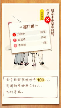 如果說紅包是一份祝福一份喜悅,那往你銀行卡里打“巨款”的都是真愛。在轉(zhuǎn)賬方面,第三方平臺(tái)的年度賬單只告訴我們的紅包發(fā)給了誰,招商銀行的年度賬單卻能給你個(gè)轉(zhuǎn)賬排行榜,告訴你誰給你轉(zhuǎn)賬的次數(shù)最多。異地戀三年的小林,最近在朋友圈發(fā)了份單身狗糧:看了我招行年度賬單的轉(zhuǎn)賬排行榜,給我轉(zhuǎn)賬最多的還是TA,遇到這樣的男人,真是不嫁不行了。一眾朋友均被閃瞎,紛紛表示:公眾場合莫秀恩愛,愛護(hù)單身狗人人有責(zé)。