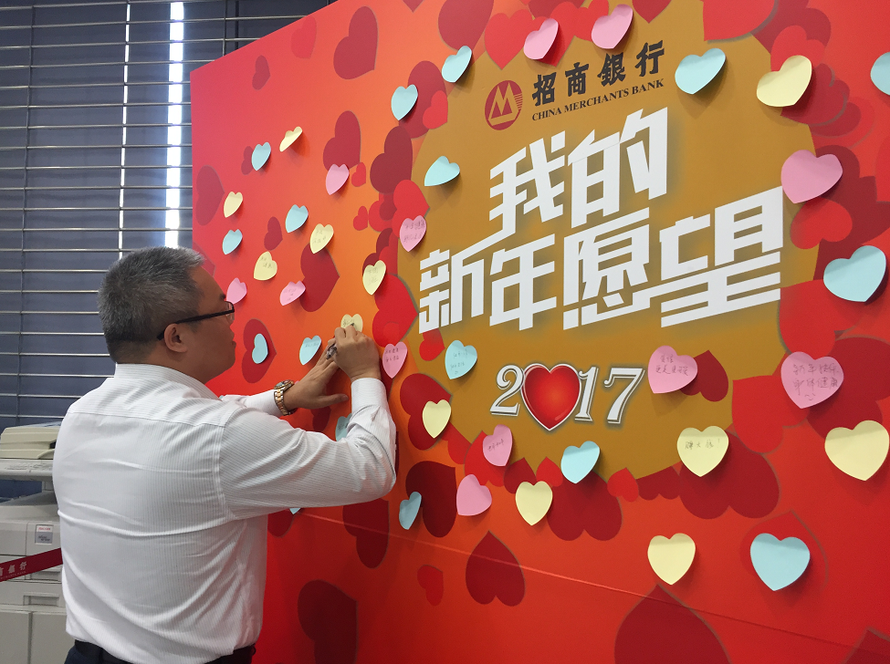 伴隨2017年新春佳節(jié)的臨近,走進(jìn)招商銀行的營業(yè)廳,喜慶、溫情、熱鬧的節(jié)日氛圍感染了每一位客戶?!案4砦业男摹?、“美好心愿帶回家”、“我對小招有話說”、“親情定制”等帶有濃厚春節(jié)特色的活動主題迅速吸引了眾人的注意力,在記者左顧右盼的間隙,新年許愿墻前面留下了許多虔誠的身影……