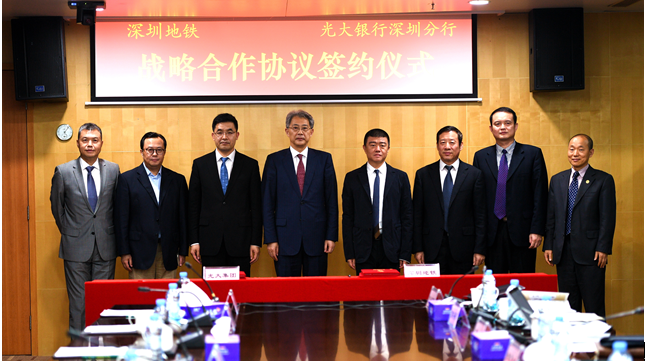 光大集團董事長李曉鵬、光大銀行行長張金良、光大集團副總經(jīng)理吳富林;深圳地鐵董事長辛杰,監(jiān)事會主席、紀委書記劉三揚、工會主席李笑竹見證簽約。深圳分行行長彭建平、深圳地鐵副總經(jīng)理張泓代表雙方簽約。