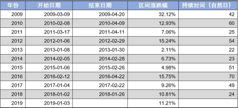 從以上統(tǒng)計(jì)數(shù)據(jù)可以明顯看到春季躁動的存在,但是持續(xù)的時間和區(qū)間漲跌幅有明顯的差異,持續(xù)時間最短的是2018年,一共24個自然日,最長的是2016年達(dá)到70個自然日。漲幅最小的是2013年,僅僅上漲2.11%,效果最不明顯。