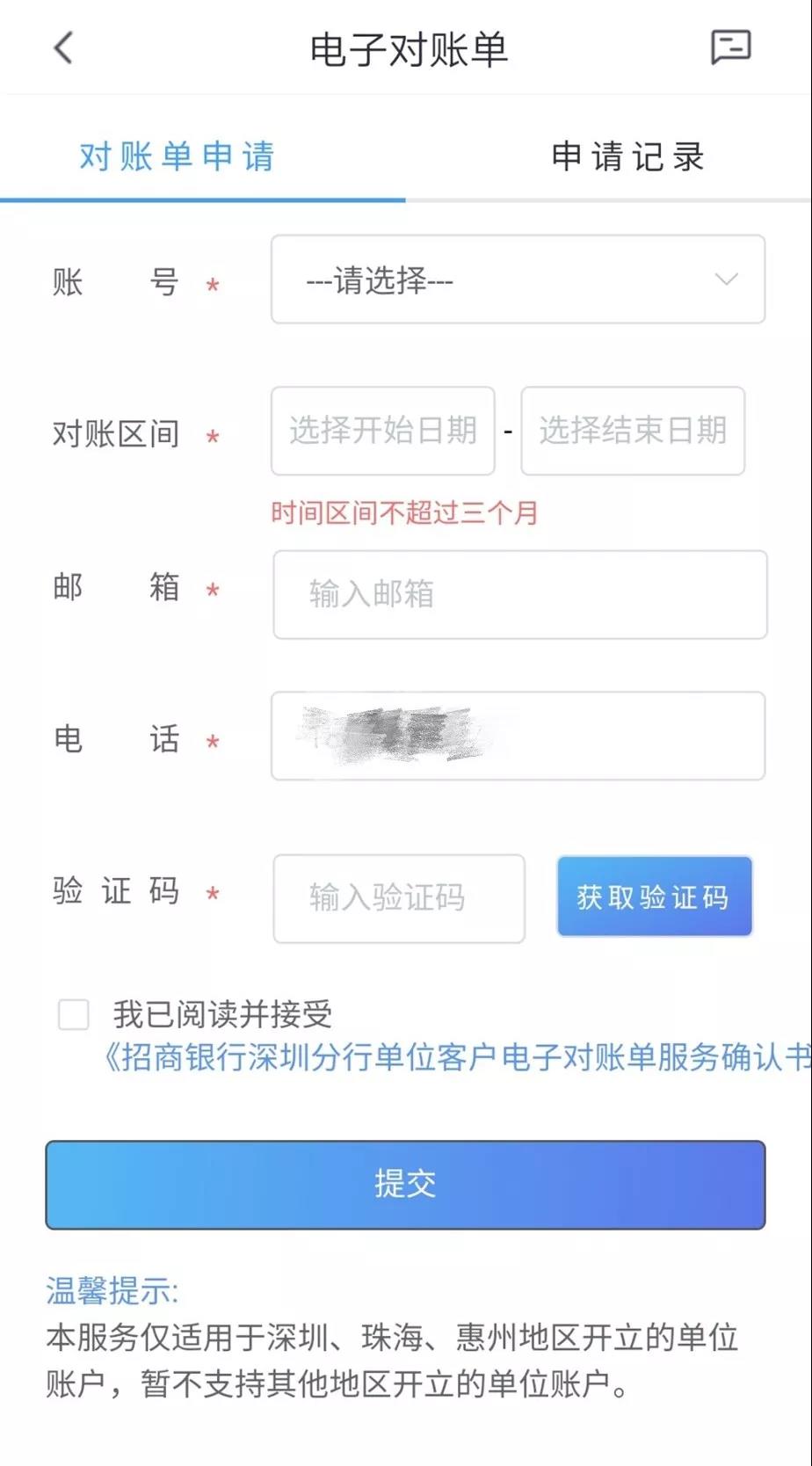 點(diǎn)擊電子對賬單,填寫對賬單申請,輸入查詢賬號和日期、接收郵箱,獲取短信驗證碼,點(diǎn)擊提交。