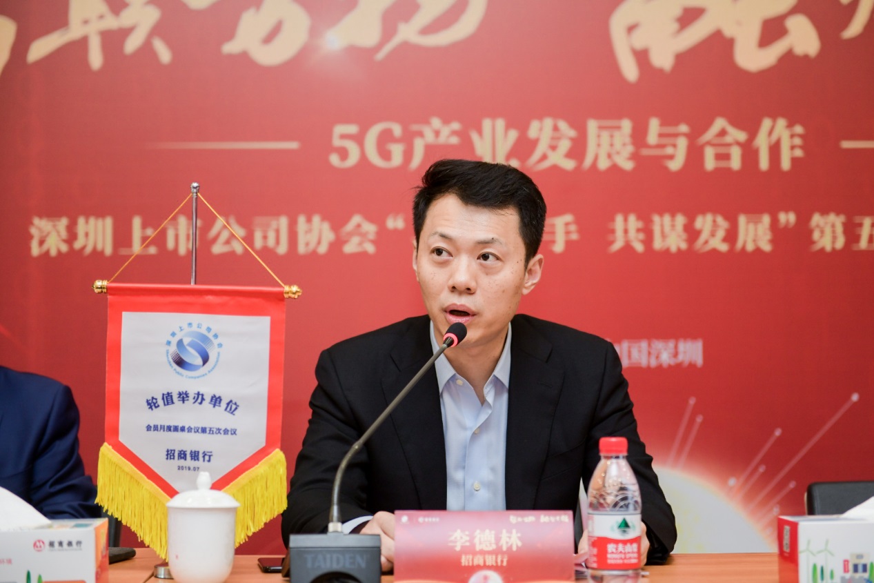 7月11日下午,由深圳上市公司協(xié)會(huì)牽頭、招商銀行股份有限公司主辦的“智聯(lián)萬物,融智有招——5G產(chǎn)業(yè)發(fā)展與合作”會(huì)員月度圓桌會(huì)議第五次會(huì)議在招商銀行深圳分行大廈3樓多功能廳成功舉行。深圳市證監(jiān)局處長(zhǎng)梁文利、協(xié)會(huì)會(huì)長(zhǎng)麥伯良、協(xié)會(huì)執(zhí)行副會(huì)長(zhǎng)兼秘書長(zhǎng)黃鐵軍、招商銀行總行行長(zhǎng)助理李德林、總行董事會(huì)辦公室主任霍建軍等領(lǐng)導(dǎo)出席了本次活動(dòng),本次活動(dòng)邀請(qǐng)了來自信息技術(shù)、制造、金融、地產(chǎn)等5 G行業(yè)的40家上市公司董事長(zhǎng)、總經(jīng)理等60余人參加活動(dòng),行業(yè)專家齊聚一堂,共話5G發(fā)展浪潮中的機(jī)遇與挑戰(zhàn)。
