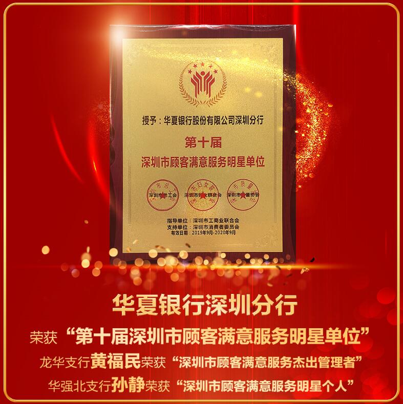 深圳新聞網(wǎng)訊 近日,華夏銀行深圳分行在“第十屆深圳市顧客滿意服務(wù)明星”暨“第二屆深圳市優(yōu)質(zhì)服務(wù)示范單位”評選活動中,榮登“深圳市顧客滿意服務(wù)明星單位”榜首,“華夏服務(wù)”品牌影響力再次得到行業(yè)和客戶的高度認可。同時,該行龍華支行行長黃福民、華強北支行副行長孫靜分別獲得“深圳市顧客滿意服務(wù)杰出管理者”和“深圳市顧客滿意服務(wù)明星”榮譽稱號。