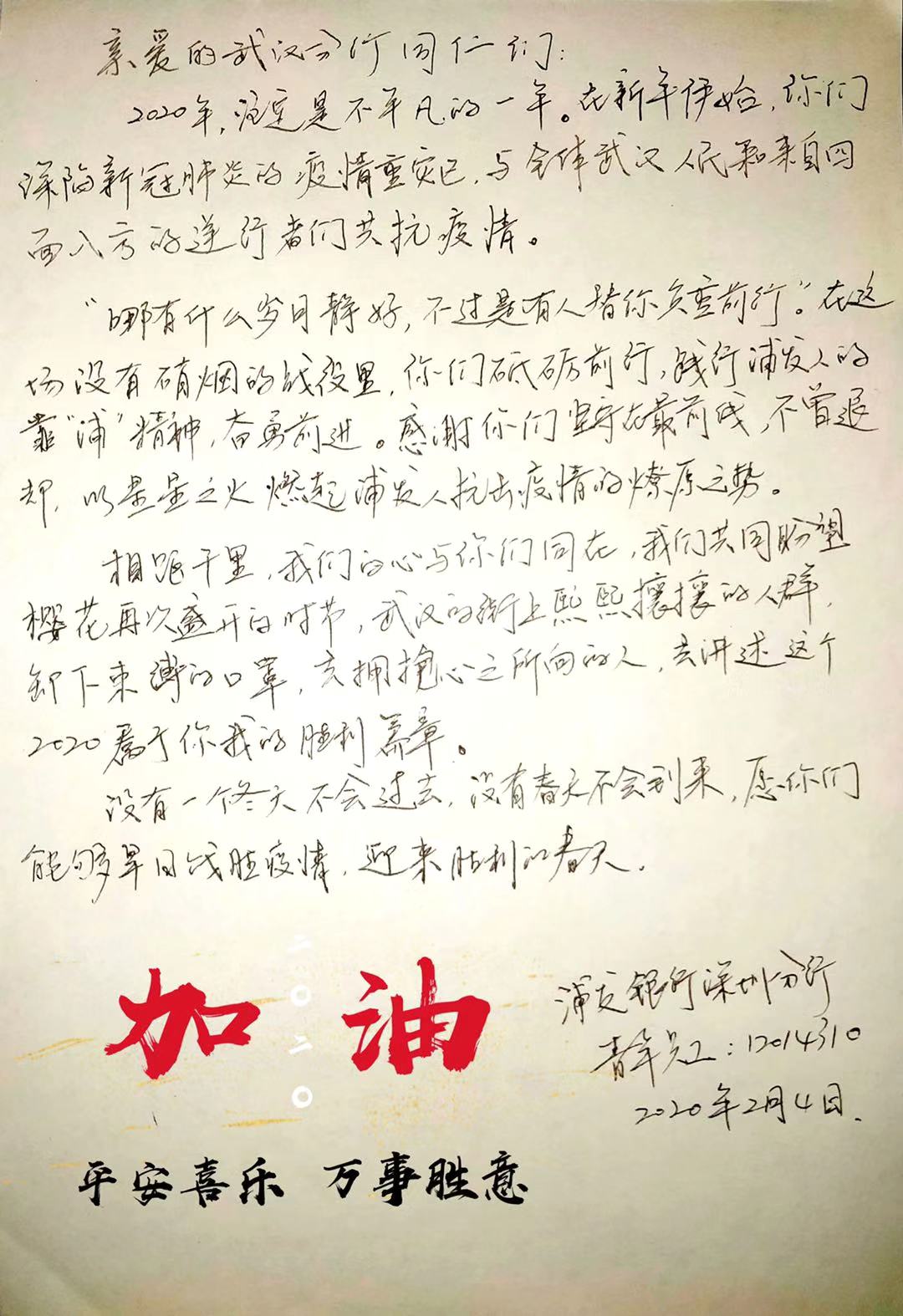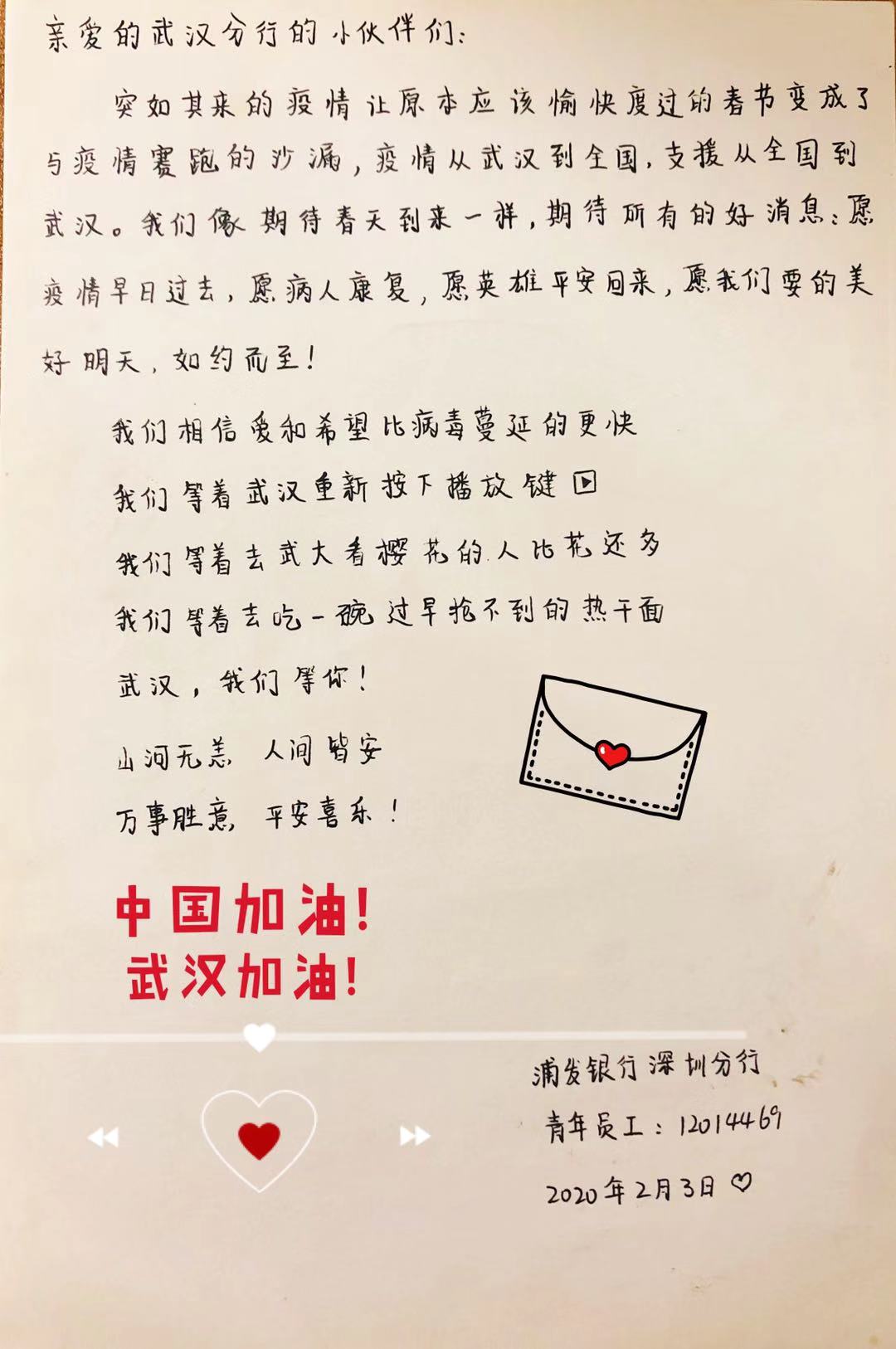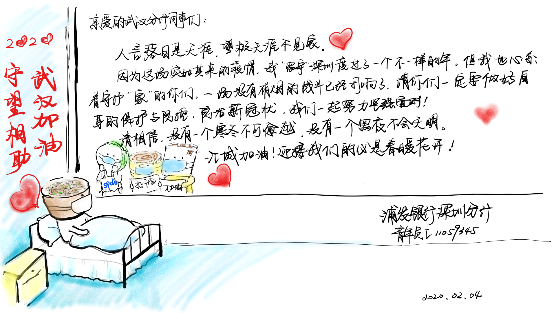 2月3日,浦發(fā)銀行深圳分行團(tuán)委向全體青年員工發(fā)出了一封倡議書。在倡議書中,該行團(tuán)委號(hào)召?gòu)V大團(tuán)干部、團(tuán)員青年立即行動(dòng),充分發(fā)揮黨的助手和后備軍作用,展現(xiàn)青年突擊隊(duì)作為,為堅(jiān)決打贏疫情防控阻擊戰(zhàn)貢獻(xiàn)力量,并向青年提出三個(gè)要求:“堅(jiān)定信心不迷茫,聽黨指揮勇?lián)?dāng)”、“科學(xué)防范不信謠,眾志成城控疫情”、“居家辦公不離崗,服從指揮勇?lián)?dāng)”。當(dāng)日,浦發(fā)銀行深圳分行發(fā)起了給武漢分行同事寄送家書的活動(dòng),該行全體青年手寫家書,圖文并茂、紙短情長(zhǎng),表達(dá)了對(duì)疫區(qū)“戰(zhàn)友們”最深切的關(guān)愛(ài)和鼓勵(lì),身體力行做好他們堅(jiān)強(qiáng)的后盾。
