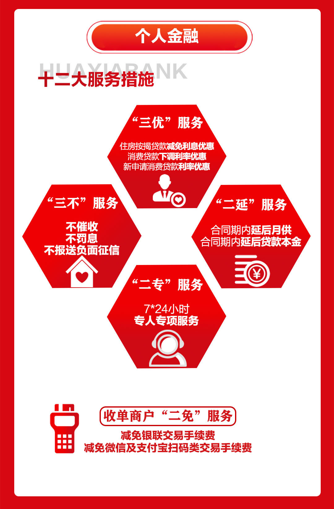 3、個貸客戶“二延”服務(wù):月供和貸款本金可在合同期限內(nèi)合理延后1-3個月還款。參加疫情防控救援的醫(yī)護人員、部隊官兵、公安干警、政府工作人員,或是受到疫情隔離影響暫時不能正常上班、失去收入來源的華夏銀行深圳分行個貸客戶,深圳分行在收到并核實客戶遞交的相關(guān)證明材料后,客戶月供和貸款本金可在合同期限內(nèi)合理延后1-3個月還款。