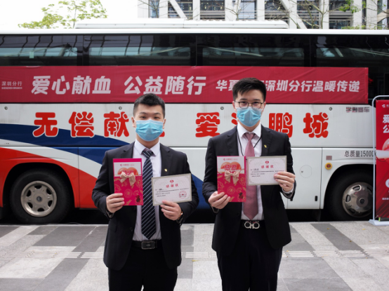 華夏銀行深圳分行行領(lǐng)導(dǎo)先后看望、慰問獻(xiàn)血員工。深圳市血液中心向華夏銀行深圳分行頒授感謝獎牌,深圳分行孫海強(qiáng)副行長代表分行向血液中心捐贈1000只口罩。