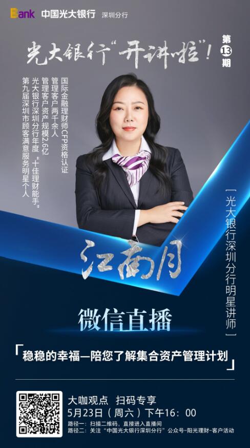 深圳新聞網(wǎng)2020年5月21日訊近日,光大銀行深圳分行將攜手《深圳晚報(bào)》于5月23日下午在線開(kāi)展第十三期《光大銀行“開(kāi)講啦”!》公益課堂。據(jù)了解,《光大銀行“開(kāi)講啦”!》是光大銀行深圳分行為客戶推出的每周線上固定公益類講座,內(nèi)容涵蓋投資理財(cái)、市場(chǎng)分析、養(yǎng)生、文化、藝術(shù)、讀書(shū)、教育、旅游、財(cái)稅等。目前已邀前故宮博物院院長(zhǎng)單霽翔、江蘇衛(wèi)視《最強(qiáng)大腦》中國(guó)隊(duì)隊(duì)長(zhǎng)李威、前華爾街投行金融專家劉湘玲、匯安基金董事總經(jīng)理魏嵬等外部專家,聯(lián)合多位銀行內(nèi)部明星講師,一起為客戶帶來(lái)精彩課程。