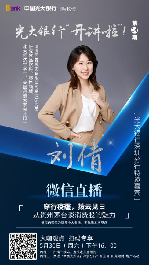 此次,光大銀行深圳分行攜手鳳凰深圳財經(jīng),邀請到北大經(jīng)濟(jì)學(xué)碩士、美國丹佛大學(xué)會計碩士、深圳民森投資有限公司資深研究員劉倩女士,在線為客戶帶來《穿行疫霾,拔云見日——從貴州茅臺看消費股的魅力》主題分享。據(jù)悉,劉倩女士關(guān)注于食品飲料、零售領(lǐng)域的投資研究。此次分享,她以眾所熟知的茅臺酒為案例,結(jié)合A股2000年至2018年漲幅數(shù)據(jù)、茅臺歷史、品牌發(fā)展、銷售渠道、市場占有等多方面,介紹孕育牛股搖籃的消費股投資邏輯,幫助更多客戶在全球受疫情沖擊、經(jīng)濟(jì)不確定時期,了解A股牛股市場邏輯、知曉投資策略提升個人資產(chǎn)。