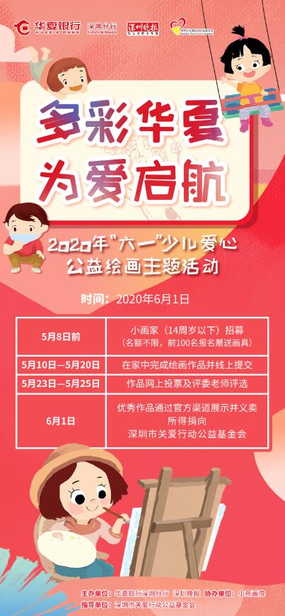 作為本次“多彩華夏為愛啟航”少兒公益繪畫活動的重磅環(huán)節(jié),在“六一”兒童節(jié)當天舉辦的義賣義捐活動也得到了社會各界的廣泛關(guān)注。參與本次義賣活動創(chuàng)作的小朋友們將獲得由深圳晚報和華夏銀行深圳分行共同頒發(fā)的“愛心小天使”獎狀。