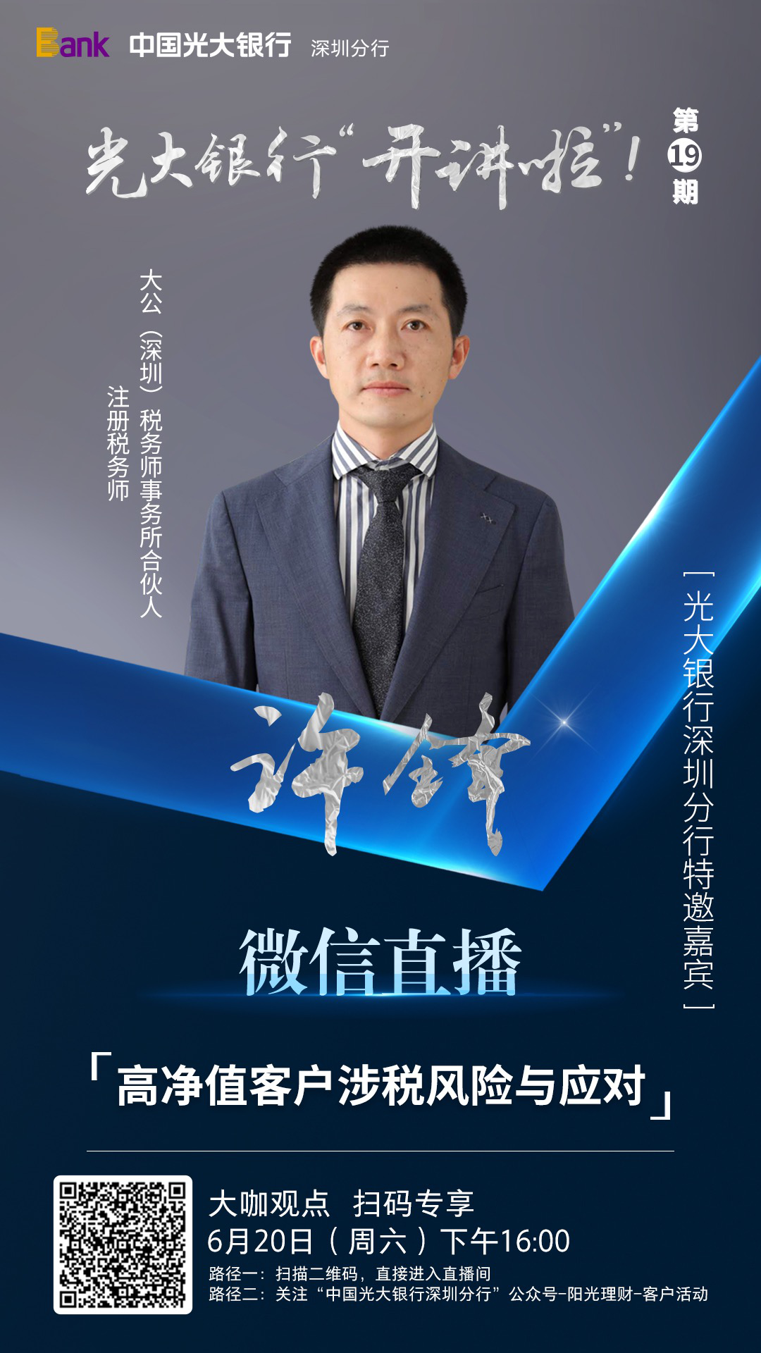 此次公益課堂邀請到大公(深圳)稅務(wù)師事務(wù)所合伙人、注冊稅務(wù)師許鋒,在線為客戶開講《高凈值客戶涉稅風(fēng)險與應(yīng)對》。他從當(dāng)前稅務(wù)形勢及改革方向、征管變化、企業(yè)及高凈值個人稅務(wù)管理與籌劃等幾個層面開講,深入剖析了中國稅制特點;并列舉具體案例,結(jié)合當(dāng)前稅收管理制度與政策,講解企業(yè)高管、高凈值人群在不動產(chǎn)投資、股權(quán)投資、公私混同的涉稅風(fēng)險;剖析家族企業(yè)股權(quán)傳承中的稅務(wù)規(guī)劃,如何打破“富不過三代”的魔咒,以及在CRS全面啟動背景下,高凈值人士如何應(yīng)對?幫助提示企業(yè)及高凈值人群,在稅務(wù)管理“全監(jiān)管”的時代,早做稅務(wù)規(guī)劃,規(guī)避稅務(wù)風(fēng)險,做到“稅稅平安”。