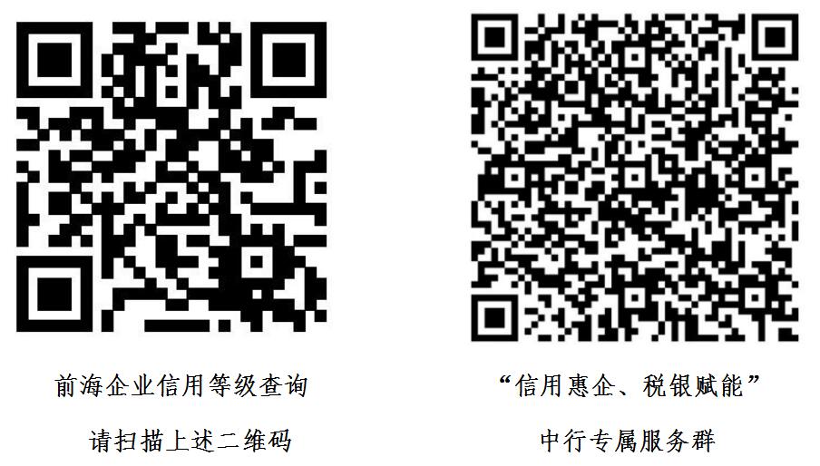 前海注冊企業(yè)可通過下左二維碼查詢前海信用等級,可通過下右二維碼加入“信用惠企、稅銀賦能”中行專屬服務(wù)群(入群請備注企業(yè)名稱),了解咨詢深圳中行針對前?!氨趟{(lán)企業(yè)”和“湛藍(lán)企業(yè)”的十項具體服務(wù)內(nèi)容。(黃璜)