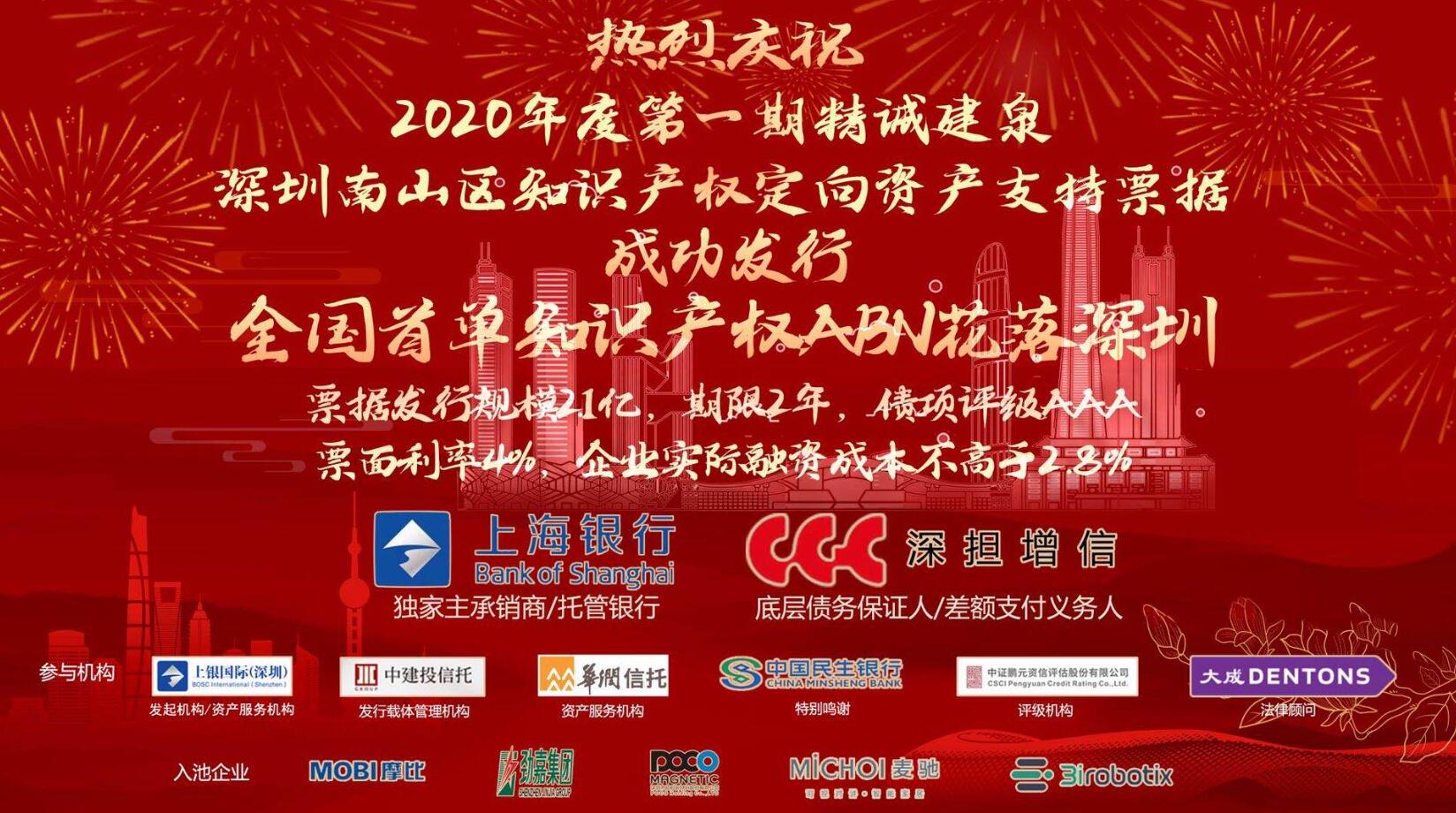 深圳新聞網(wǎng)·見圳客戶端2020年9月23日訊 昨日,隨著上海銀行股份有限公司主承的“上銀國際投資(深圳)有限公司2020年度第一期精誠建泉深圳南山區(qū)知識產(chǎn)權(quán)定向資產(chǎn)支持票據(jù)”成功發(fā)行,中國銀行間交易商協(xié)會首單民營科技中小企業(yè)專項知識產(chǎn)權(quán)ABN項目花落深圳。該項目不僅是對知識產(chǎn)權(quán)證券化的一次創(chuàng)新和實踐,也為中小民營科技企業(yè)開辟了一條在銀行間市場融資的新渠道。本期ABN共五家入池企業(yè),發(fā)行規(guī)模2.1億元,期限兩年,票面4%,經(jīng)南山區(qū)政府補貼和深圳擔保集團費用減免,入池企業(yè)實際融資成本低于年化2.80%。 一直以來,上海銀行以“精誠至上,信義立行”為核心價值觀,堅持“融智”與“融資”有機結(jié)合,以實體經(jīng)濟需求為導向,不斷推進產(chǎn)品創(chuàng)新,持續(xù)為實體經(jīng)濟發(fā)展提供更高質(zhì)量、更有效率的金融服務。此次首單知識產(chǎn)權(quán)ABN項目花落深圳,不僅是深圳不斷強化金融創(chuàng)新所取得的重要成果,更是上海銀行探索服務深圳、服務實體經(jīng)濟新模式的重要實踐。