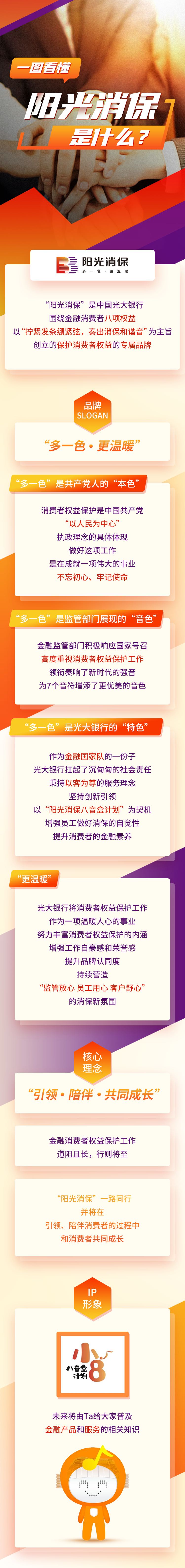 中國光大銀行“陽光消保”品牌標識,貫徹了“一個光大”的品牌管理原則,突出了金融消費者權(quán)益保護與銀行現(xiàn)有業(yè)務的依存及拓展關系,在全面貫通現(xiàn)有服務基礎上,針對金融消費者權(quán)益的“八項基本權(quán)益”,向全社會做出了“引領·陪伴·共同成長”的莊嚴承諾。