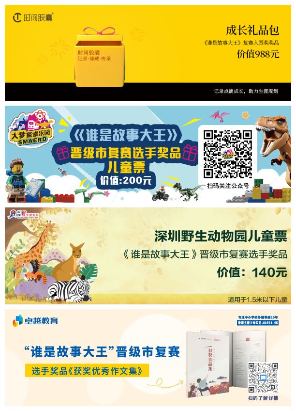 據(jù)了解,“誰(shuí)是故事大王·第四季”分為小中組(3-4年級(jí))和小高組(5-6年級(jí)),入圍深圳市復(fù)賽的學(xué)生,即可將獲得由時(shí)間膠囊、大夢(mèng)探索樂(lè)園、卓越教育、深圳野生動(dòng)物園等提供的豐厚大禮?!罢l(shuí)是故事大王·第四季”深圳市復(fù)賽將于2020年12月12日、12月13日舉行,具體比賽時(shí)間地點(diǎn),組委會(huì)將以短信和電話的形式通知復(fù)賽入圍學(xué)生。