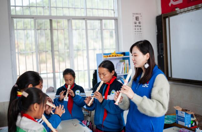 當音樂老師帶著吉他出現(xiàn)在課堂上時,孩子們的眼里充滿了光,這是他們第一次看到了真實的吉他,還在它的伴奏下唱歌。因缺乏專業(yè)音樂老師,學校音樂器材室里的樂器也是常年不見天日。這次,音樂老師翻出了長久沒用的大小鼓,挑人、訓練,組建了學校里的第一鼓隊,這支鼓隊可以像模像樣地為學?;顒宇A熱了。