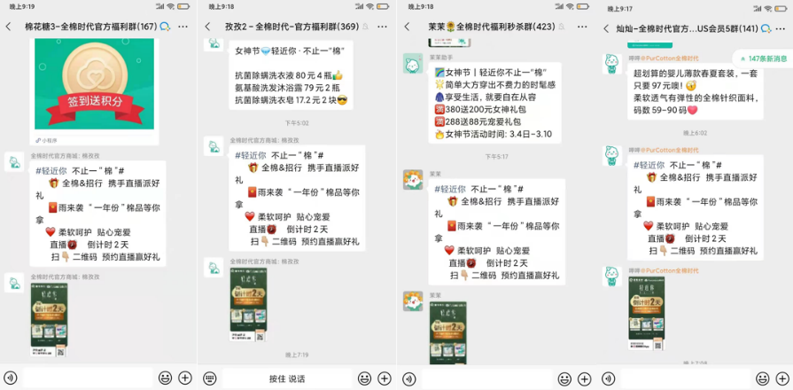 為了提升活動效果以及節(jié)日噱頭,招行深圳分行積極向商戶爭取了全棉時代的直播禮品,直播當(dāng)天全棉時代為招行用戶提供價值50萬的禮品,同時在宣傳端,為了打造活動熱點(diǎn),全棉時代在超過500個社群內(nèi)進(jìn)行活動推送,招行端也積極爭取總行資源,在App、微信視頻號及朋友圈進(jìn)行宣傳。