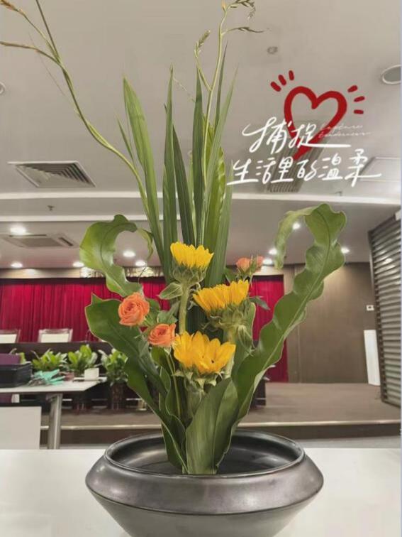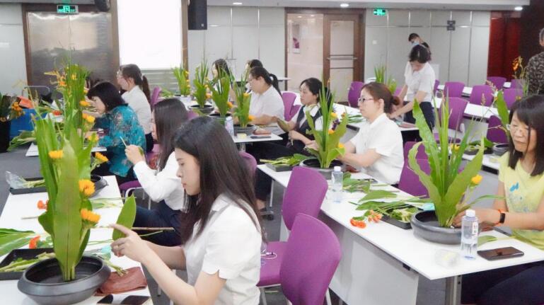 活動現(xiàn)場,馮老師詳細介紹了傳統(tǒng)花藝的歷史文化、插花造型、色彩搭配、器具應用等基礎(chǔ)知識,從花語寓意、花材修剪、構(gòu)圖等方面深入淺出的講解插花的要點。在悠然的花香浸染間,輕柔的音樂熏陶中,大家按照馮老師展示的步驟,將花朵、樹葉精心剪裁、混搭、點綴成束,將一朵一朵鮮花、綠葉錯落有致地插在花盆中里,普通的花葉、枝條,經(jīng)過大家精巧的修飾與加工之后,變成了令人賞心悅目的藝術(shù)品。整個會場花香四溢,歡聲笑語,充滿了輕松歡快的氛圍。
