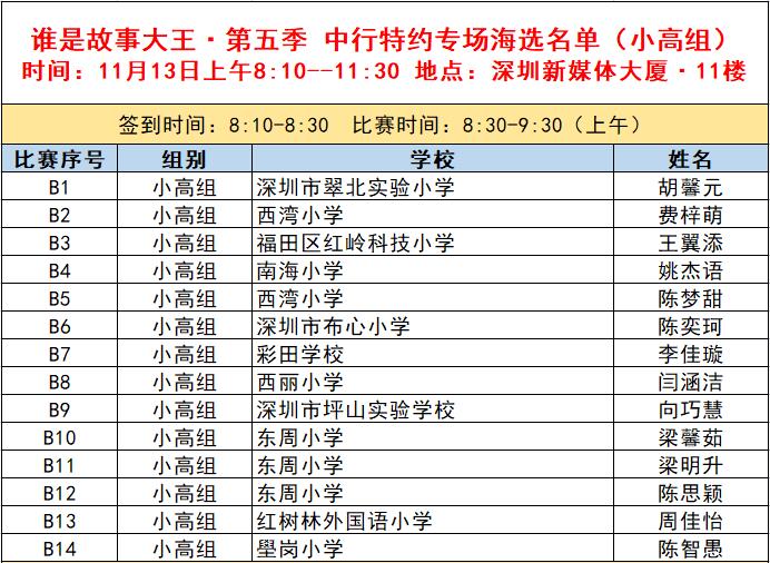 “誰是故事大王·第五季”分為小中組和小高組,此次中行特約專場海選報名的學生將以脫稿的形式,不限主題,在限時5分鐘內,講述積極健康向上的故事。評委老師們將從四個維度進行評分,其中內容占50%、表現(xiàn)技巧占30%、儀態(tài)占10%,以及時間掌控、創(chuàng)意特色呈現(xiàn)等占10%。最終,本場活動將選拔出部分學生晉級“誰是故事大王·第五季”深圳市復賽,他們將和來自指定校園分賽區(qū)、特約專場以及線上分賽區(qū)的選手一起爭奪深圳市決賽名額?,F(xiàn)將上場順序(即所在小組的序號順序)、名單、簽到時間、比賽時間公布如下: