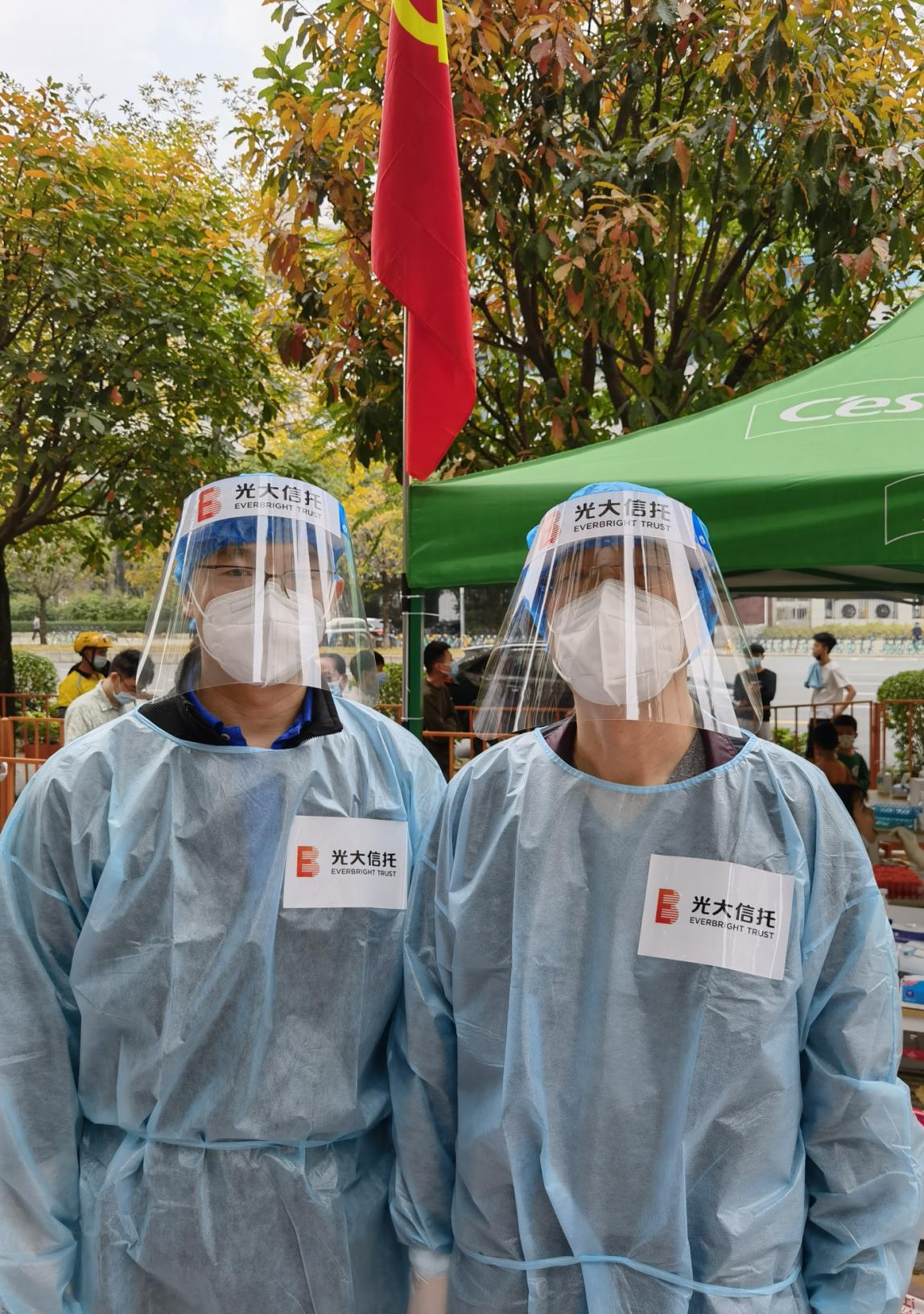 光大信托深圳區(qū)域黨支部在接到協(xié)同抗疫通知后,第一時間組織黨員和員工積極報名參與志愿服務(wù)。3月5日,恰逢毛澤東主席“向雷鋒同志學(xué)習(xí)”題詞的紀(jì)念日,光大信托公司風(fēng)險總監(jiān)姚恒民同志以年近6旬的高齡,率先垂范的沖在一線,帶領(lǐng)深圳區(qū)域黨員同志們,投入福田區(qū)蓮花街道獅嶺社區(qū)的核酸檢測志愿服務(wù)工作,用實際行動和赤誠情懷書寫共產(chǎn)黨員的責(zé)任和擔(dān)當(dāng)。當(dāng)天天氣炎熱,太陽暴曬下穿著防護(hù)服兩個小時工作下來,全身已完全濕透,但他們以飽滿的激情、負(fù)責(zé)任的態(tài)度詮釋了一個共產(chǎn)黨員在黨旗下宣誓的誓言。光大信托的一位黨員同志說:“疫情就是命令,防控就是責(zé)任,崗位就是戰(zhàn)場,每個服務(wù)點的黨旗就是一種信仰,每個黨員就是一面旗幟,每個黨支部就是一個堡壘,哪里有需要,哪里就有光大人的身影。”