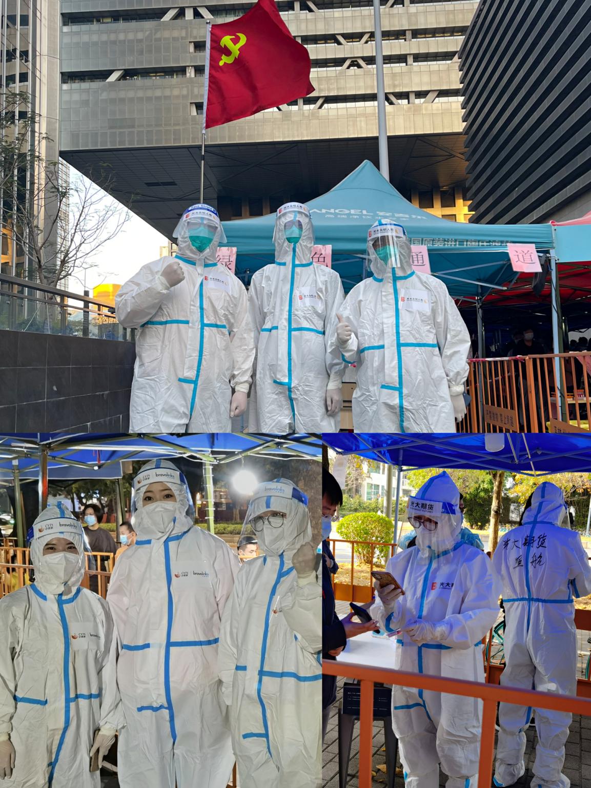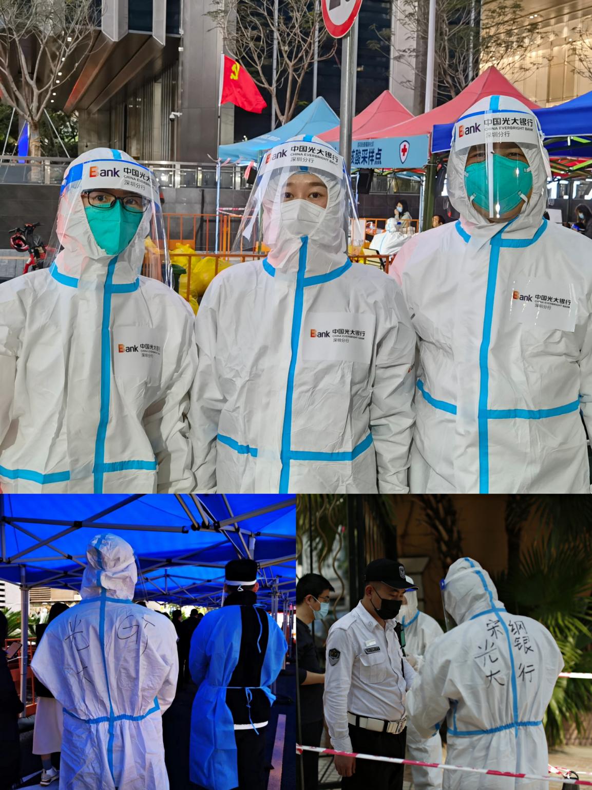 在疫情防控的關(guān)鍵時期,深圳分行黨委堅決貫徹落實當(dāng)?shù)卣姆揽匾螅中悬h委書記、行長韓學(xué)智同志緊急召開黨委會議,啟動應(yīng)急預(yù)案,積極部署并投入疫情防控工作,確保日常營運和客戶服務(wù)等工作有序運轉(zhuǎn)。在深圳福田區(qū)金融工作局的組織與號召下,分行黨委要求全體黨員干部發(fā)揮先鋒模范作用,主動為社區(qū)疫情防控工作提供志愿服務(wù)。分行黨委委員們率先垂范,分頭帶領(lǐng)黨員干部奔赴社區(qū)慰問抗戰(zhàn)一線工作人員,并犧牲周末休息時間深入社區(qū)核酸采樣點,脫下西裝變身“大白”。深圳分行各黨支部和團(tuán)支部先后組織開展各類志愿服務(wù)累計時長超過100小時,活躍在防疫抗疫一線的同志們在全力保障廣大群眾金融服務(wù)需求的同時,和醫(yī)護(hù)工作者一同守護(hù)著千家萬戶。作為集團(tuán)駐深企業(yè)協(xié)同工作的牽頭單位,分行牽頭組建駐深企業(yè)志愿者先鋒隊,緊急投身福田區(qū)抗擊疫情的各個戰(zhàn)線和各個角落,不分晝夜、不論疲倦、以實際行動踐行初心、使命和擔(dān)當(dāng),弘揚新時代共產(chǎn)黨人的奉獻(xiàn)精神?!叭绻皇怯H身體驗志愿者服務(wù)工作,永遠(yuǎn)不知道抗疫人員的工作是如此辛苦!有多少人在負(fù)重前行才確保了深圳市民有序和安寧的生活。此刻很想擁抱可親可敬的你們,防護(hù)服雖然阻擋了我們的擁抱,但無法阻擋我們一起抗擊疫情的心。”一位志愿者這樣記錄到。