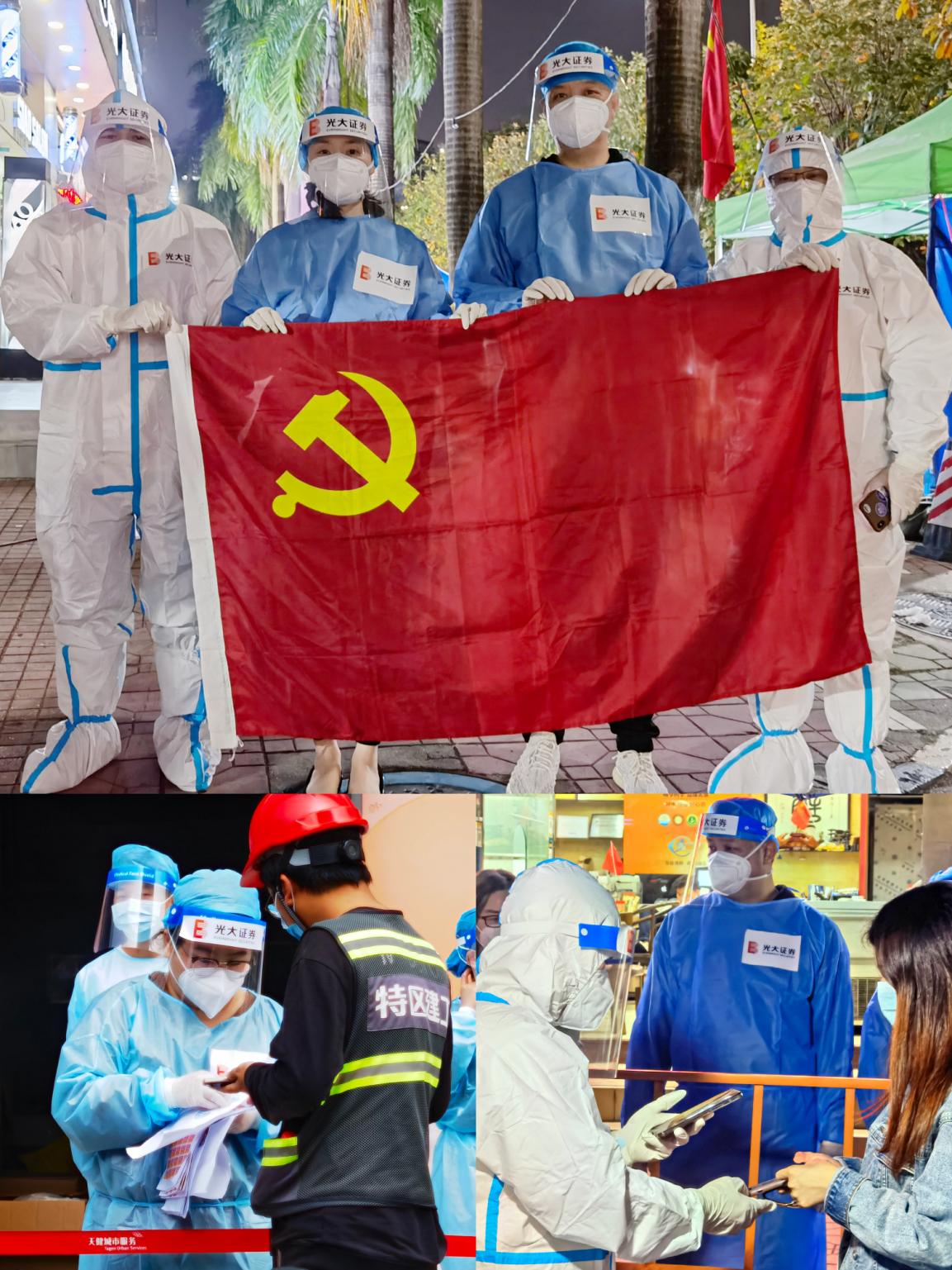 光大證券深圳分公司發(fā)揮基層黨組織戰(zhàn)斗堡壘作用和黨員先鋒模范作用,黨員干部迅速牽頭組建了“光證深分先鋒隊”,下沉基層抗疫一線,黨員同志們換上防護(hù)服、手套和隔離面罩深入蓮花街道多個社區(qū),全力協(xié)助醫(yī)護(hù)人員做好核酸檢測的輔助工作。從白天到黑夜的堅守,頂著溫差很大的深夜寒風(fēng),保持良好狀態(tài),為廣大群眾的身體健康安全提供了有力保障。一句句暖心的提示、一個個忙碌的身影,光大證券深圳分公司的志愿者們,用實際行動,堅定地守護(hù)著鵬城的人們!