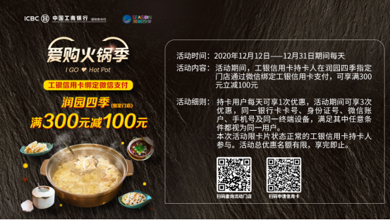 12月31日前每天,微信綁定工銀信用卡在潤園四季指定門店消費(fèi)滿300元減100元!