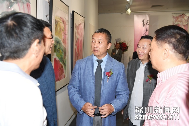 圖為香港中聯(lián)辦宣傳文體部副部長(zhǎng)朱挺(右三)出席紀(jì)光吉畫展?!?/p>
