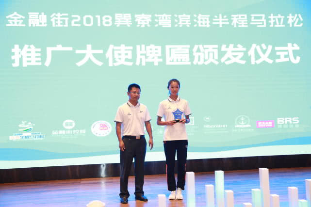 發(fā)布會上,金融街惠州置業(yè)有限公司總經理梁成藝代表金融街2018巽寮灣濱海半程馬拉松籌委會給賽事代言人焦安靜頒發(fā)推廣大使牌匾。