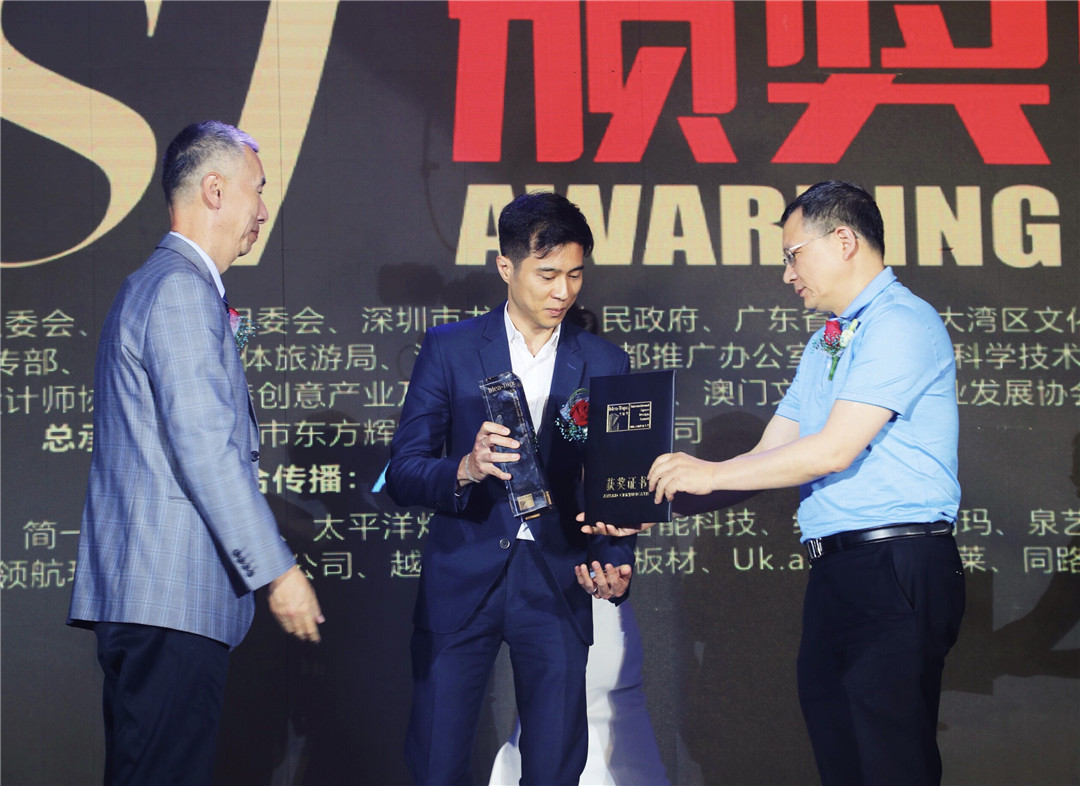 △廣東省粵港澳大灣區(qū)文化創(chuàng)意產(chǎn)業(yè)促進(jìn)會(huì)會(huì)長(zhǎng)張宇航、哈佛大學(xué)建筑設(shè)計(jì)博士、臺(tái)灣亞洲大學(xué)副校長(zhǎng)劉育東為臺(tái)灣設(shè)計(jì)師沈中怡頒發(fā)“最佳綠色建筑設(shè)計(jì)獎(jiǎng)”