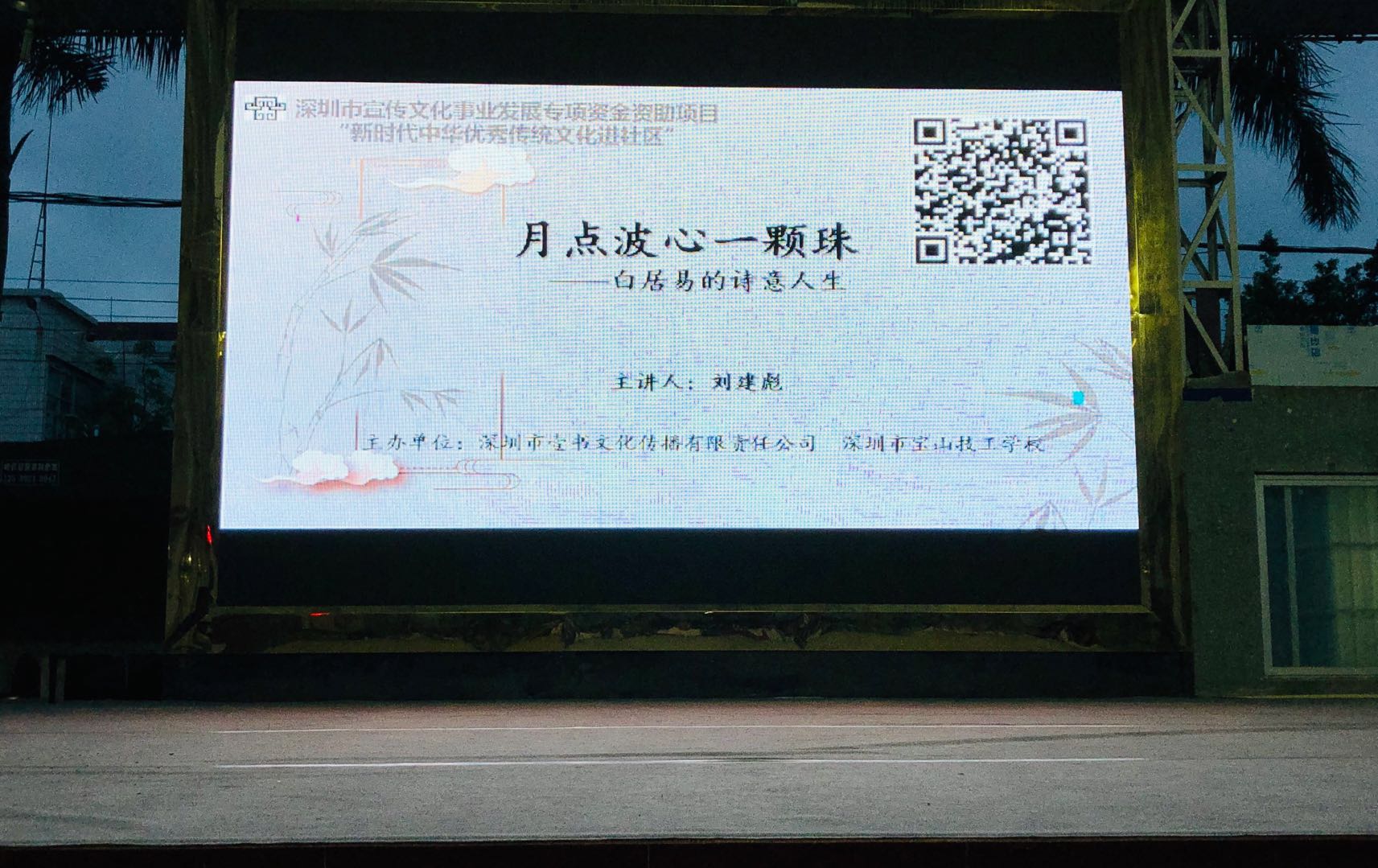 深圳新聞網訊 5月29日晚上,“新時代中華優(yōu)秀傳統(tǒng)文化進社區(qū)”系列活動第三場公益文化講座之“月點波心一顆珠——白居易的詩意人生”在深圳市寶山技工學校寶山大舞臺拉開帷幕,由愛詩家創(chuàng)始人劉建彪帶領聽眾一同走進“詩王”的詩意世界,感悟其至情至性。